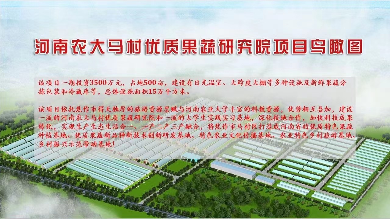 河南農(nóng)大馬村優(yōu)質(zhì)果蔬科教園區(qū),暨河馬仙果小鎮(zhèn),是河南農(nóng)業(yè)大學(xué)與焦作馬村區(qū)人民**深度合作的現(xiàn)代農(nóng)業(yè)產(chǎn)業(yè)項(xiàng)目,是以優(yōu)質(zhì)瓜果蔬菜種質(zhì)資源創(chuàng)新和新品種選育、配套技術(shù)研究為基礎(chǔ)的綜合性農(nóng)業(yè)園區(qū)。該項(xiàng)目占地500畝,建設(shè)有實(shí)用型日光溫室、大跨度大棚等多種設(shè)施及果蔬分揀包裝車間和冷藏庫(kù)等,總體設(shè)施面積約15萬(wàn)平方米。